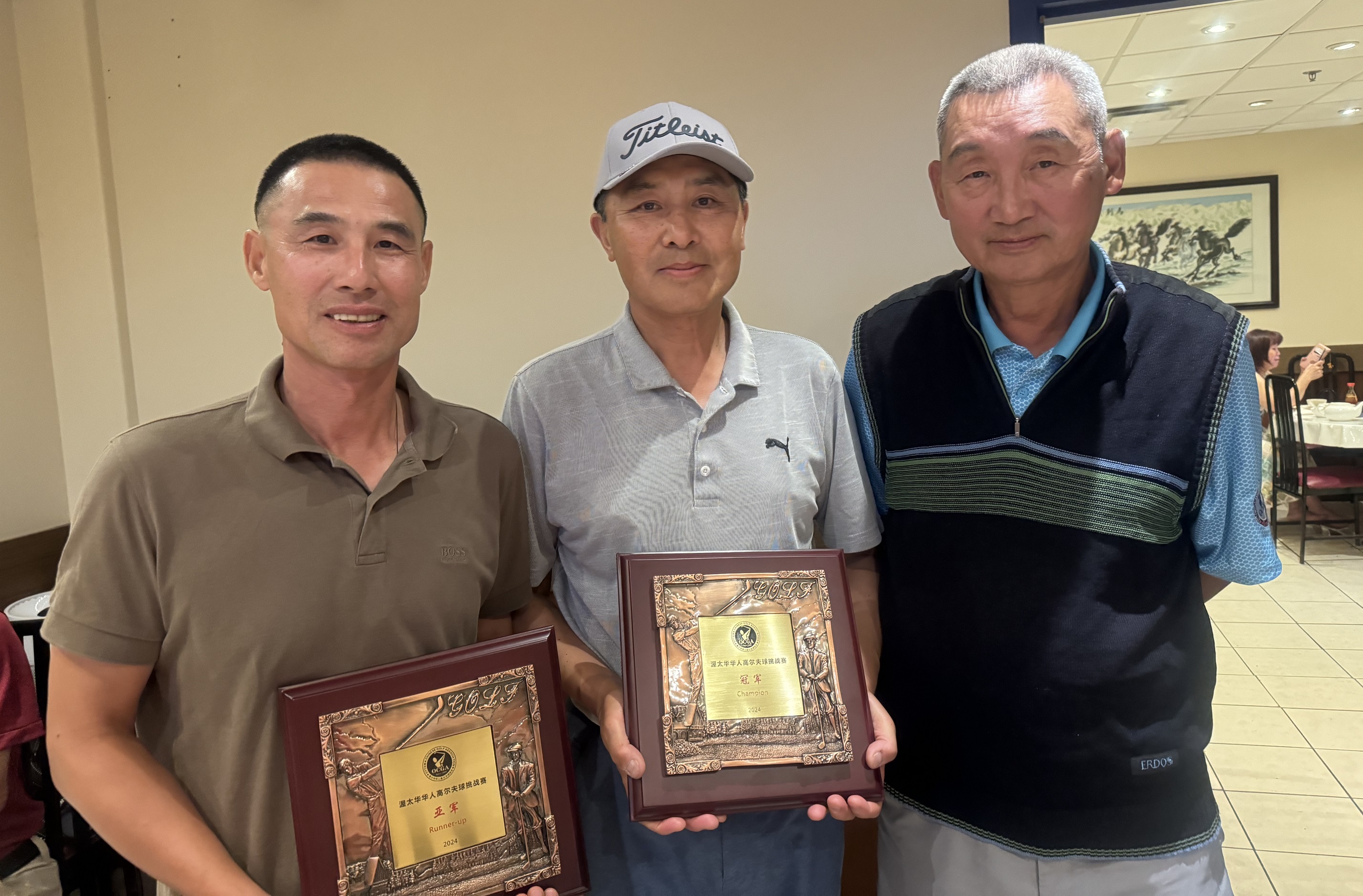 图片二: 渥太华华人高尔夫球协会主席穆宏超先生和获得比赛冠亚军的选手合影(左起为本次比赛亚军丁巍,冠军籍传翔及穆宏超先生)