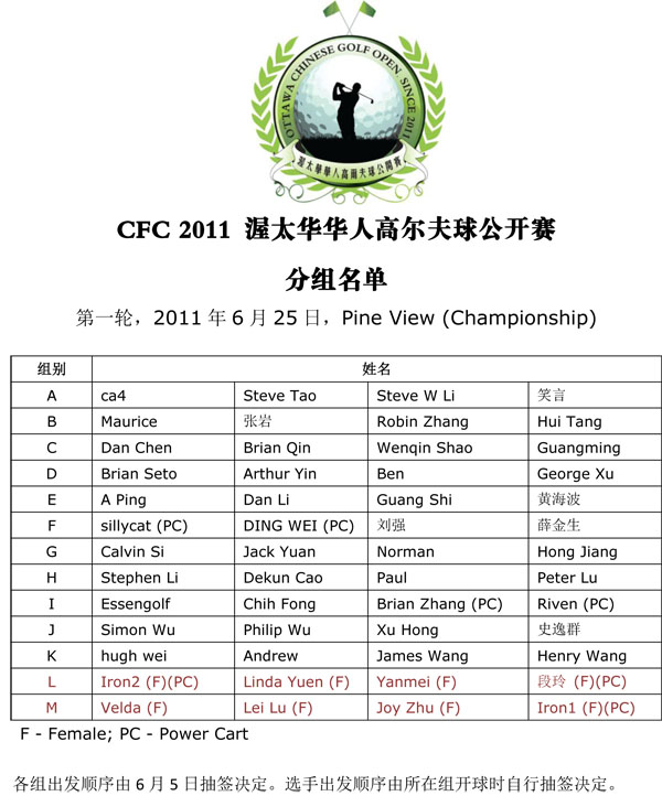 CFC 2011 渥太华华人高尔夫球公开赛第一轮分组名单