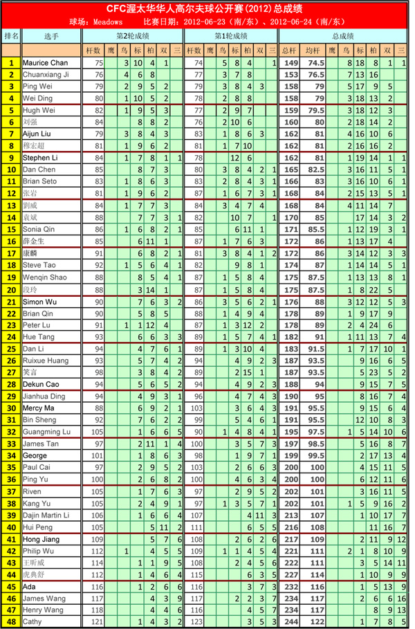 CFC渥太华华人高尔夫球公开赛(2012)完全成绩