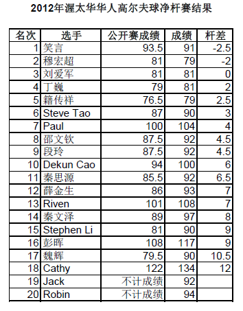 渥太华华人高尔夫球净杆赛于2012年8月18日星期六在Pine View - Championship Course 圆满结束。共有5组20名选手激烈角逐,最终笑言笑到最后,以91杆(-2.5杆差)获得冠军。
