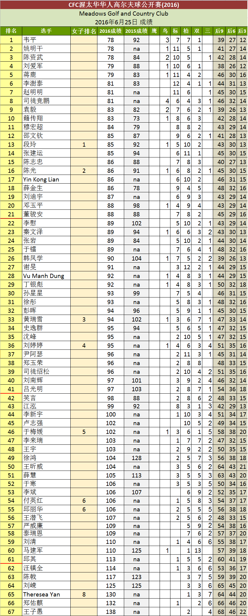 CFC渥太华华人高尔夫球公开赛(2016) 成绩单